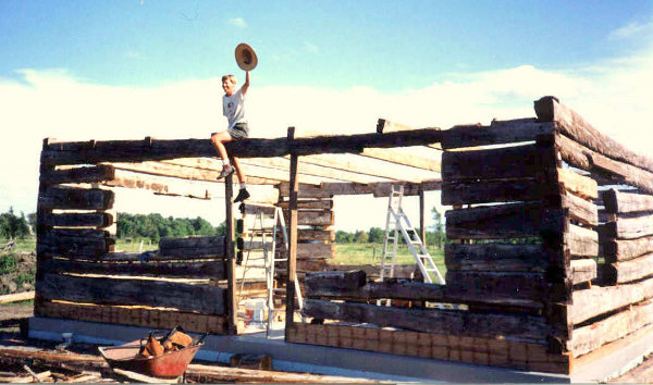 Karen celebrating the top logs in place at the studio location.