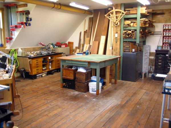 The upstairs portion of the studio, with space for hand work, assembly, and finishing.